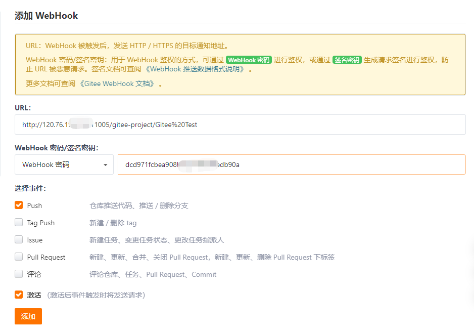 项目的管理选项卡,左侧有个WebHooks菜单 ,点击【添加webHook】: